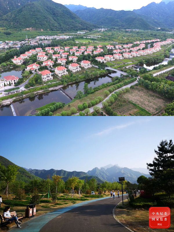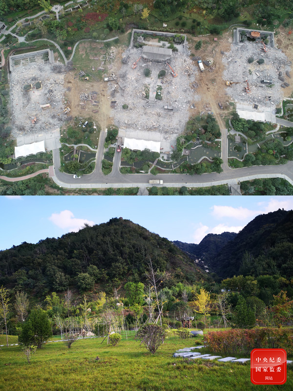 上图为2018年9月拍摄的正在拆除中的秦岭违建别墅“长安文化山庄”。下图为2019年9月拍摄的“长安文化山庄”拆除后建成的“长安文化公园”一角。