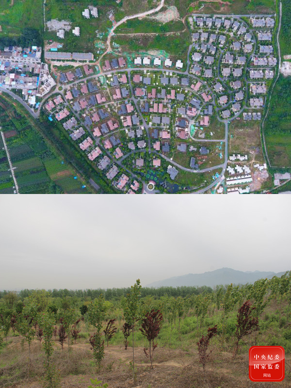 上图为2018年拍摄的拆除前的秦岭违建别墅“达观天下”俯瞰图。下图为2020年4月拍摄的 “达观天下”拆除后栽种的树苗。