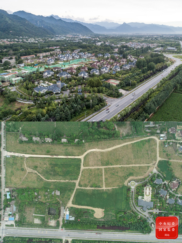 上图为2018年8月拍摄的秦岭违建别墅“山水草堂”拆除前俯瞰图。下图为2020年4月拍摄的“山水草堂”拆除后覆土复绿现状。
