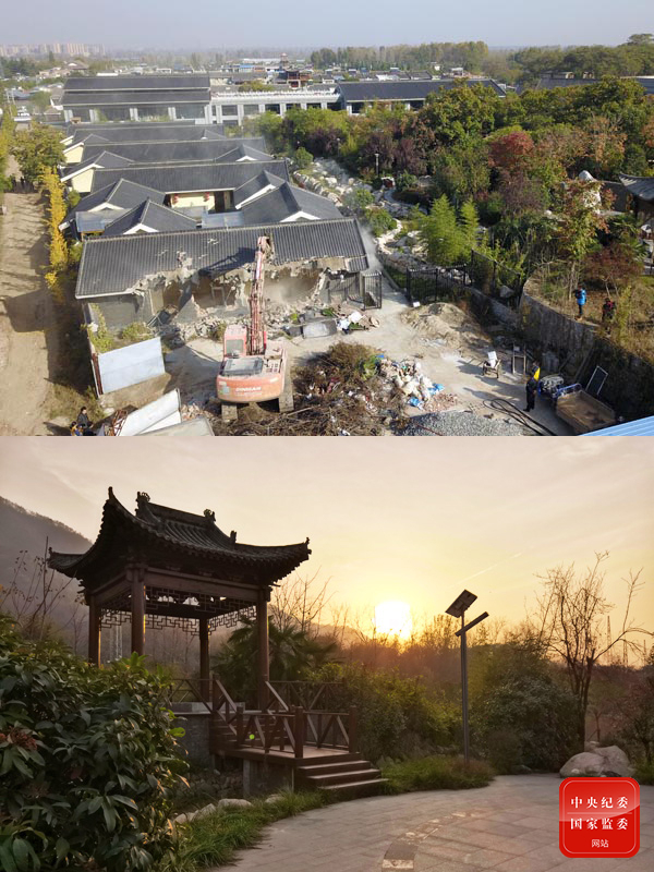 上图为2018年10月拍摄的正在拆除中的秦岭违建别墅“长安上王卧福温泉酒店”。下图为2019年11月拍摄的“长安上王卧福温泉酒店”拆除后建成的“翠微宫园”一角。