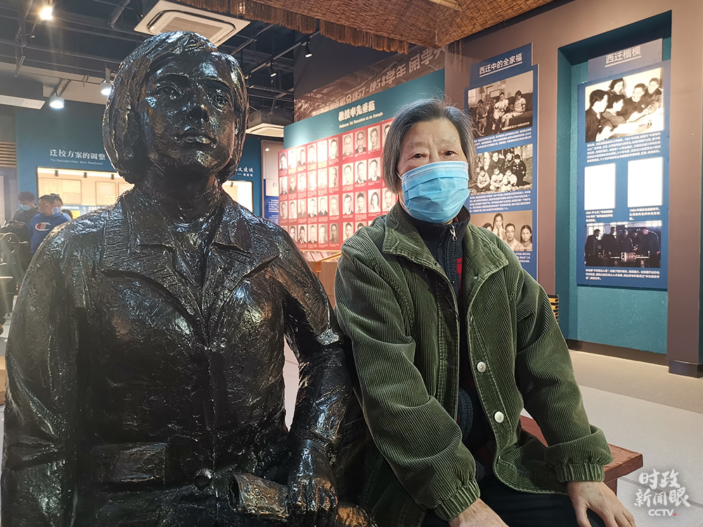 △这位精神矍铄的老教授叫胡奈赛,当年西迁时,她只有22岁。交大西迁博物馆开放后,她一直有个心愿,想跟图左的雕塑合张影。因为雕塑的衣服是仿照西迁时她穿过的衣服样式制作的,实在太有纪念意义。今天,她梦想成真。(总台央视记者王晓东拍摄)